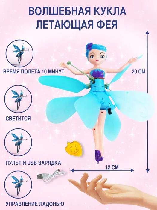 Предварительно зарядите игрушку от USB шнура. Изготовлена из нетоксичного, безопасного пластика. Если обычные куклы у вашего ребенка уже не вызывают восторга, то самое время удивить его. Летающая игрушка фея не оставит никого равнодушным.
